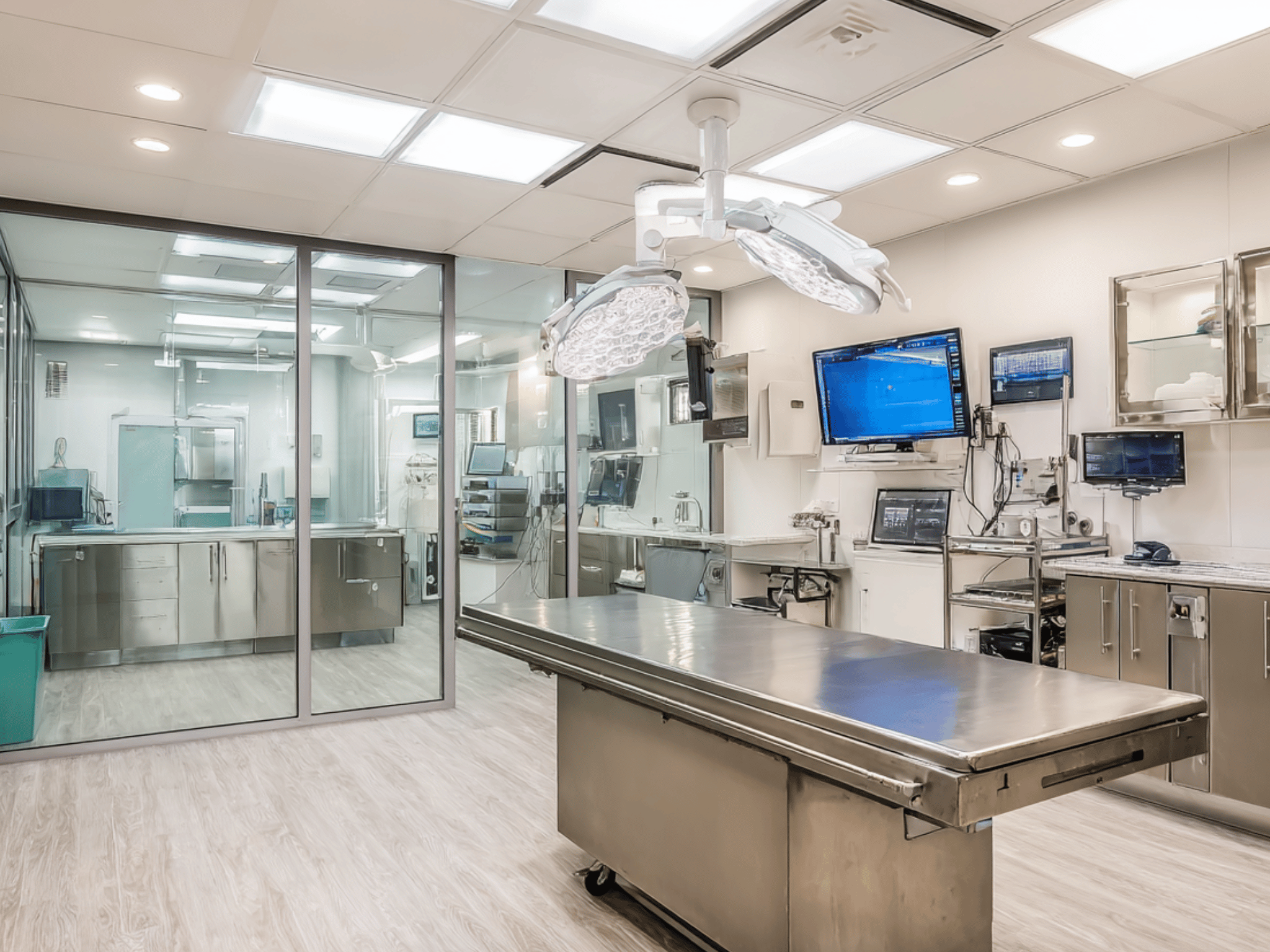 As part of the same project, Kinetic Contracts delivered a purpose-built veterinary operating suite designed to meet the highest hygiene and safety standards. Featuring stainless-steel surfaces, glass partitions, integrated lighting, and advanced medical equipment, the space was engineered for efficiency, visibility, and compliance with RCVS clinical standards.