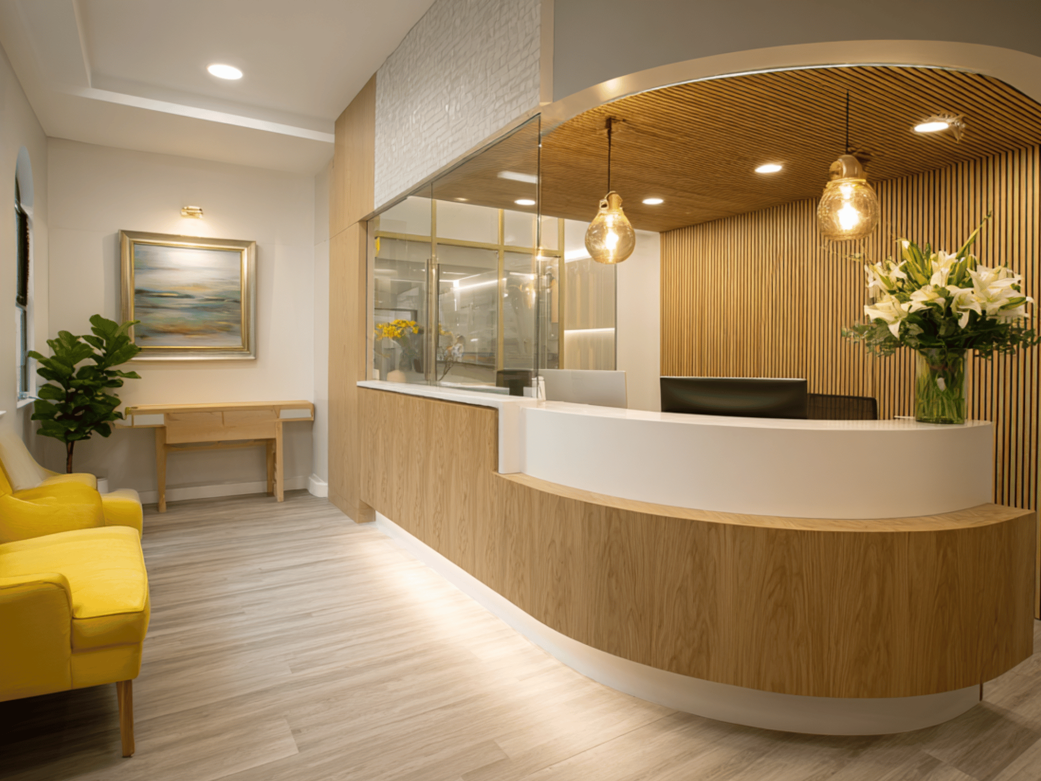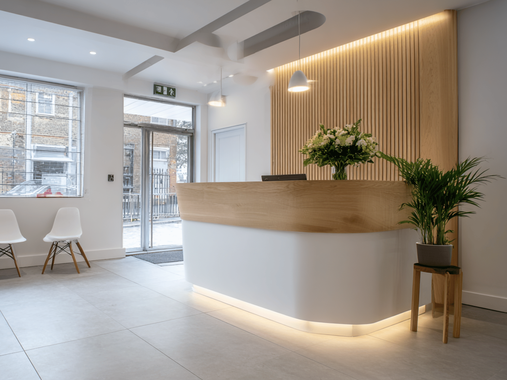 Kinetic Contracts delivered a complete reception fit out for Willow Dental Practice, creating a welcoming, design-led space that enhances patient experience. The scheme features curved timber joinery, acoustic slatted wall panels, and warm pendant lighting complemented by soft furnishings and natural tones.
